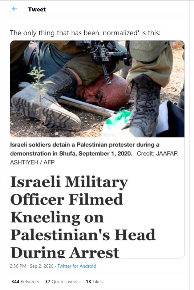 به گزارش سرویس بین الملل خبرگزاری صداوسیما ، محمدجواد ظریف وزیر امور خارجه کشورمان ضمن بازنشر تصویر یک نظامی صهیونیستی که حین بازداشت یک فلسطینی زانوی خود را روی گردن وی قرار داده است، در توئیتی نوشت: